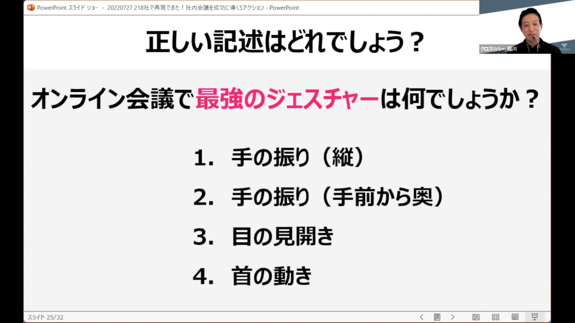 なお、『超・会議術~テレワーク時代の新しい働き方』の著者・越川慎司氏は、「トップ5パーセントの人事評価をもらう管理職の方は、頷きの深さが3.5〜4cm深い」と、オンライン会議における最強のジェスチャーとして「うなずき」を挙げています。
