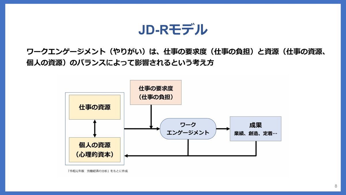 この調査を考える上で、「JD-Rモデル」という、ワークエンゲージメントについての考え方を用いて分析を進めています。「JD-R」というのは、「Job Demand(仕事の要求)」と「Resource(資源)」ということですね。「Job Demands-Resources model」というものです。