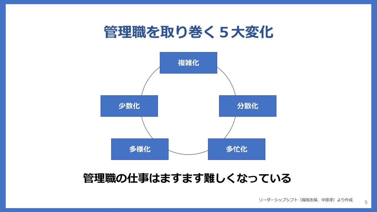 さらに「多忙化」ということで、以前に比べて管理職の方も人数が減り、兼務やさまざまな業務を任されることが増えてきています。この5つの変化が、管理職の仕事をますます難しくしている状況です。