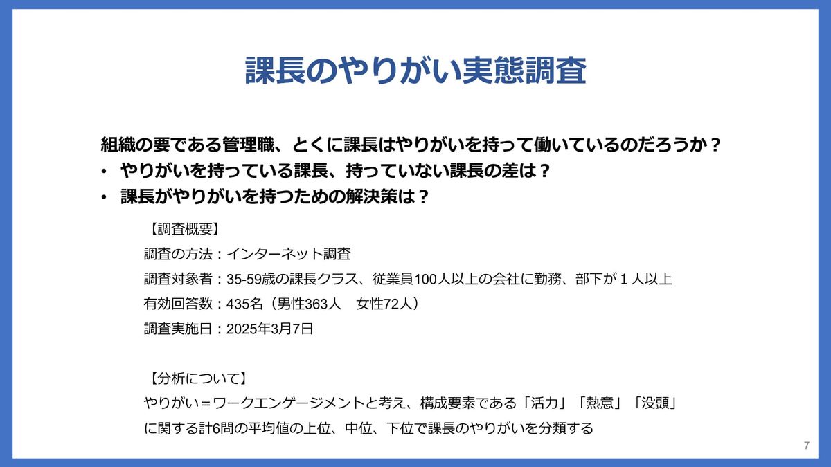 今回は組織の要である管理職の、特に課長にフォーカスしました。「課長はやりがいを持って働いているのだろうか?」「やりがいを持っている課長と持てていない課長には、どんな差があるのだろうか?」。さらには「課長がやりがいを持つための解決策は何なのだろうか?」ということを調べたく、実態調査を進めました。