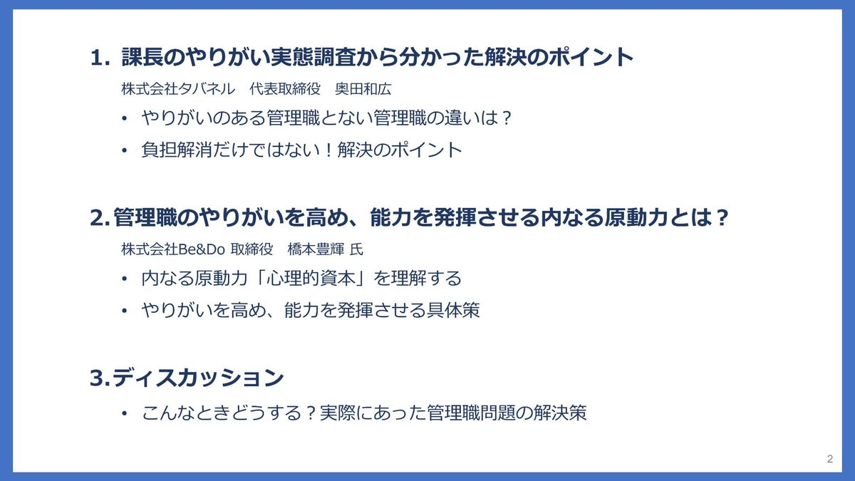 13時から14時まで、「管理職のやりがい再生のカギを徹底解説」ということでスタートしていきたいと思います。私、タバネルの奥田と、株式会社Be&Doの橋本さまにご登壇いただくかたちで進めていきたいと思います。橋本さん、ごあいさつをよろしいでしょうか。
