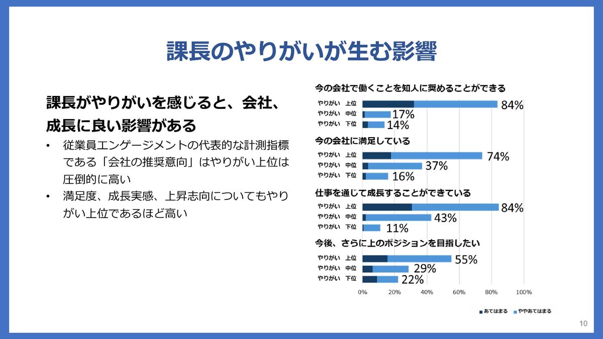 その他にも、「会社に満足」「仕事を通じて成長できる」「さらに上のポジションを目指したい」というようなことも、やりがいを持てている人のほうが高いと。やはり、高いやりがいを感じている課長の方が増えることは、会社にとっても、その人にとってもいいということがよくわかります。