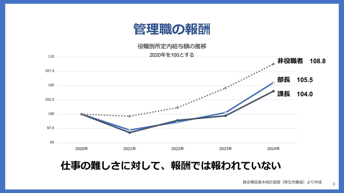 さらに昨今、みなさまの会社でも賃上げ、報酬アップが行われているかと思います。賃金構造基本統計調査を複数年調べてみたところ、コロナ禍以降の賃上げの情勢としては、非役職者に比べて、部長や課長はそこまで上がっていないことがわかります。