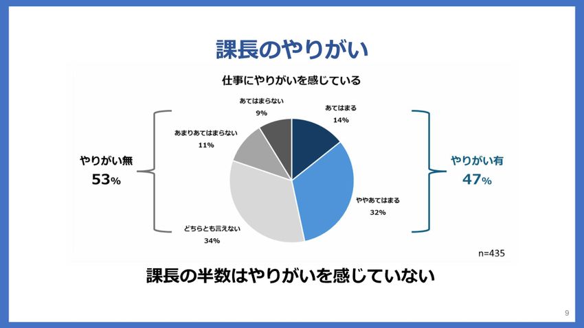 奥田:まずこの調査の大前提として、「課長の方はやりがいを持っているんだろうか?」ということで、「仕事にやりがいを感じているかどうか」についておうかがいしました。「やりがいあり」と答えた人が47パーセント、「やりがいなし」と答えた方が53パーセントということで、組織の要である課長の半数がやりがいを感じていない状況が明らかになりました。