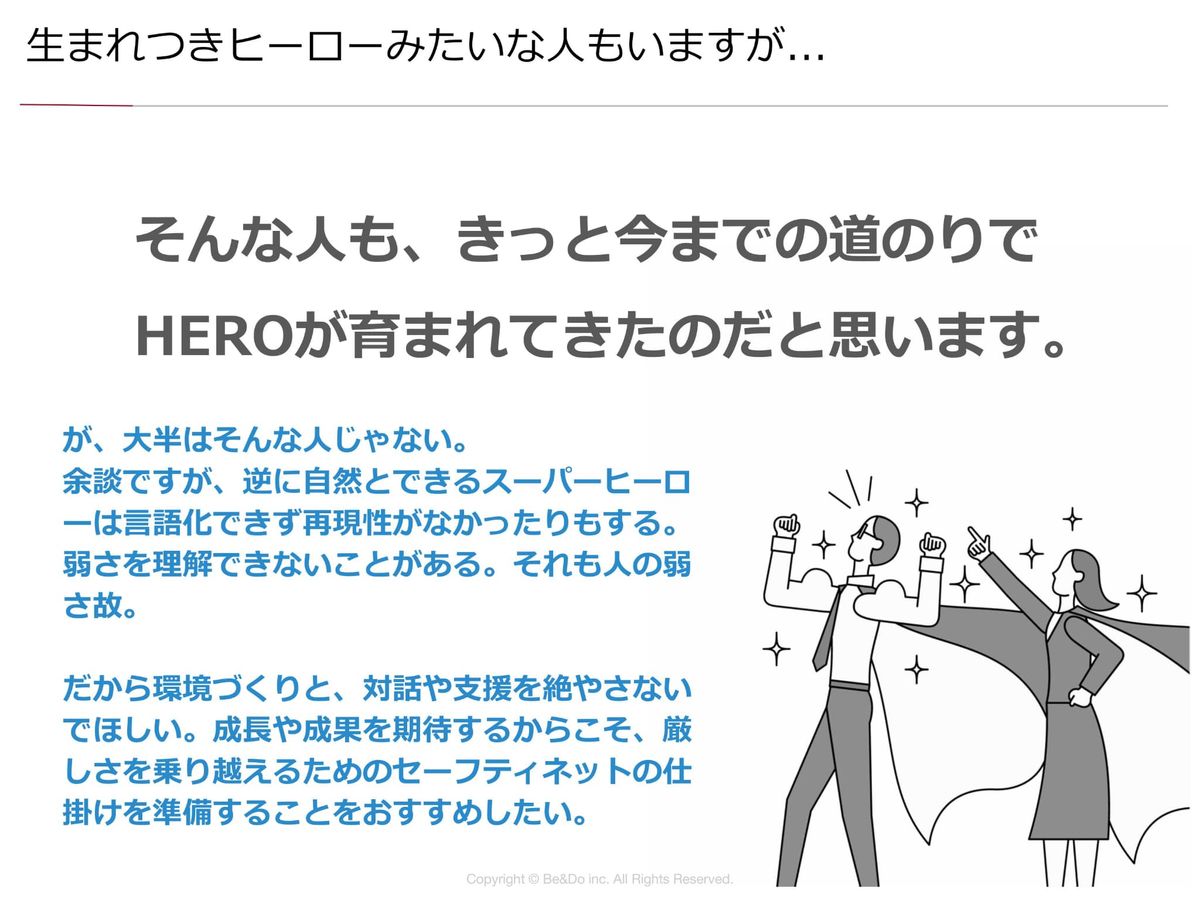きっとそういう人たちも大人になるまでの間に、先ほどの「HERO」を高めるような思考やプロセスを自然と経験しながらやってきたんだと思うんですけれども。大半はそうではないです、という前提を置いておきたいなと思います。