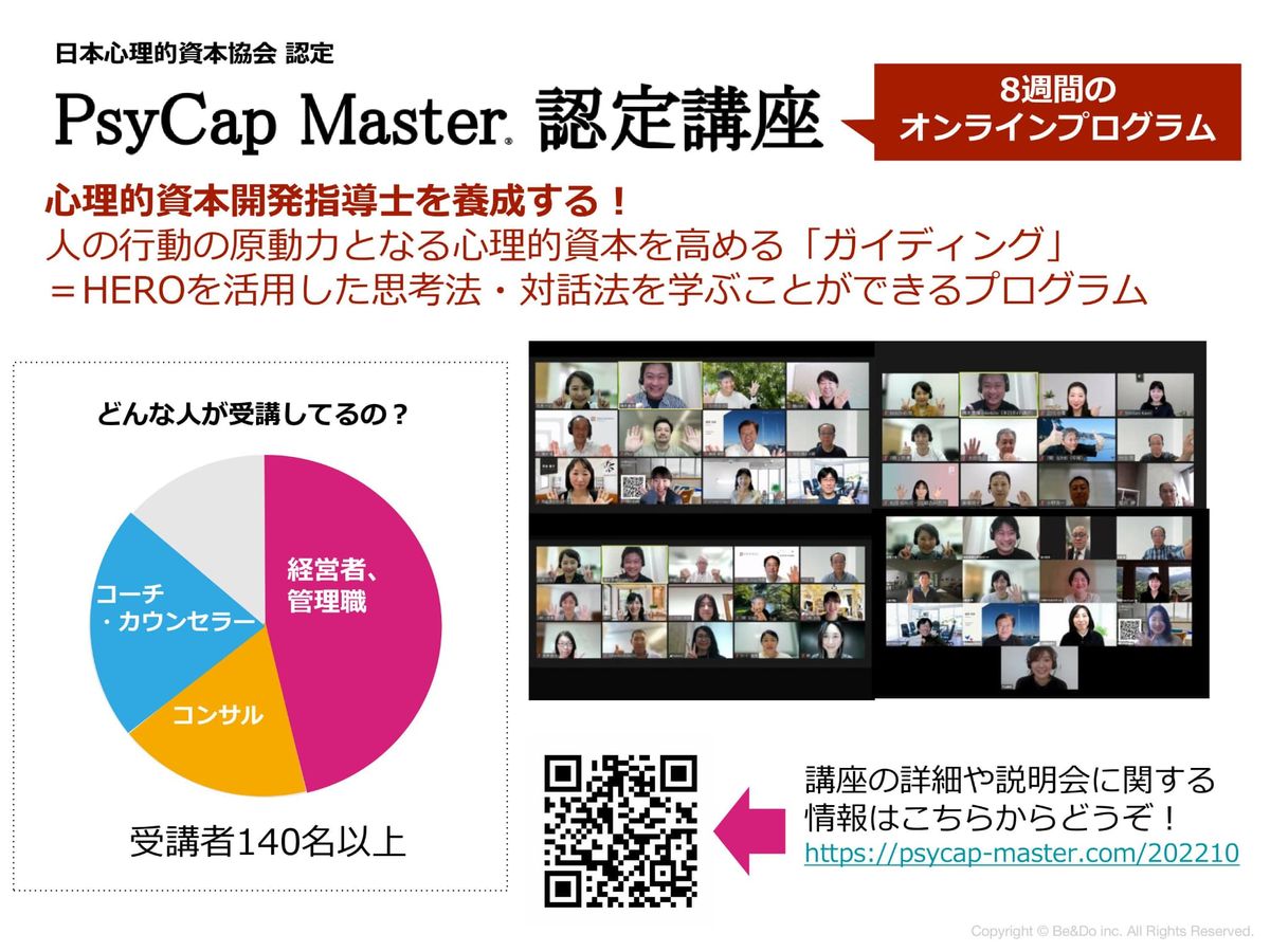 最後に私から簡単にご案内をしたいなと思うんですが、心理的資本を高める方法を学ぶ「PsyCap Master認定講座」というオンライン講座もやっておりますので、関心を持っていただけましたら、ぜひ受講いただけたらなと思います。
