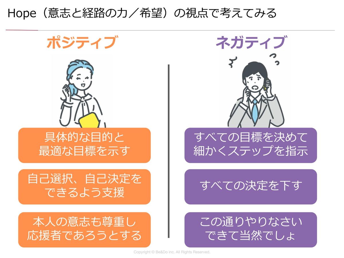 目標設定をする時には、ちょっと「Hope」を高める視点でサポートしてください。行動して、振り返る時には「Optimism」の視点で内省、リフレクションを支援してください。