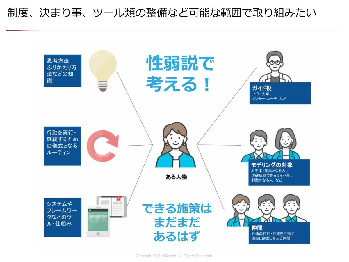 なので、性弱説を前提にすることと、心のエネルギーをプラスにする関わり方・思考法を掛け合わせて施策を考えていただきたいなと思います。