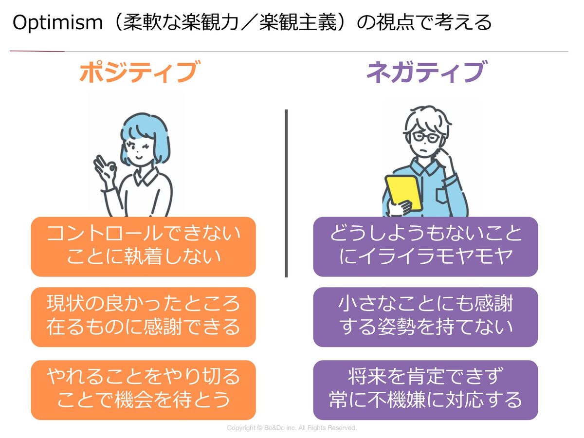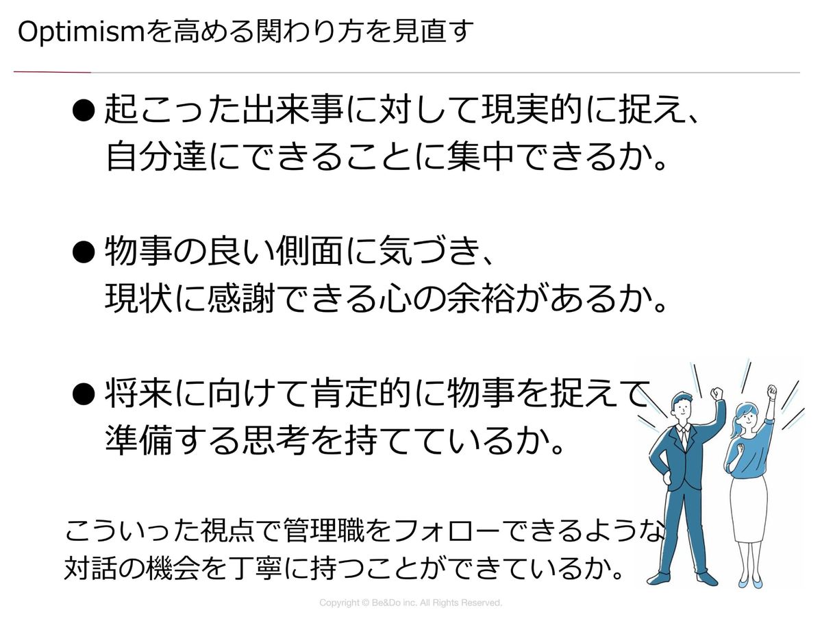 個人的には、「Optimism」も管理職で特に重要かなと思っています。コントロールできないことにモヤモヤ、イライラしてしまうと、ついつい心の余裕がなくなって小さなことにも感謝する姿勢が持てなくなり、将来を肯定できず常に不機嫌になってしまう。そうすると、ハラスメントのような言動につながってしまうわけなんですよね。