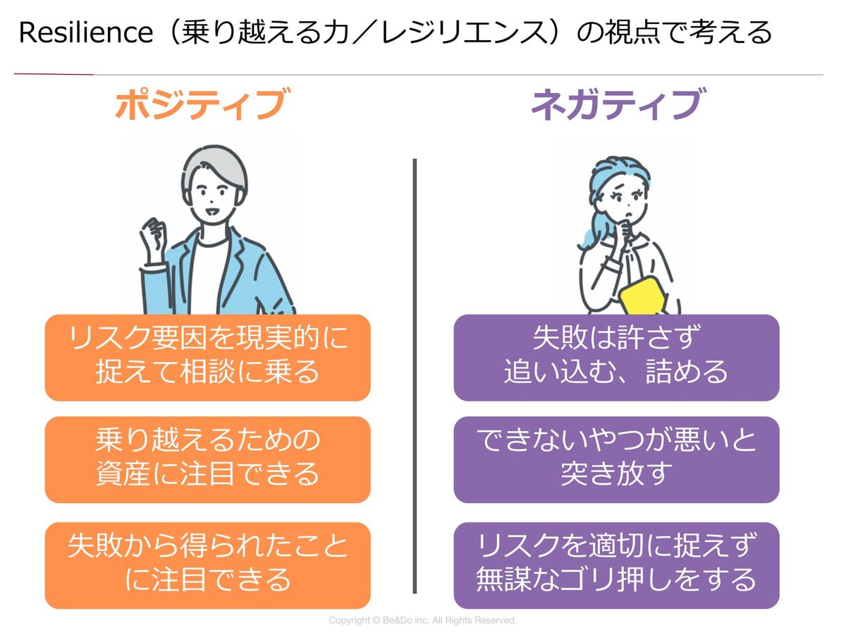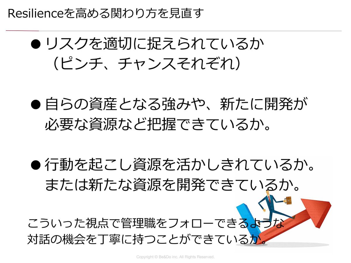 さらにフィードバックを伝える時には、ポジティブフィードバックで「Efficacy」を高める関わり方をしてください。目標を立て直す時とか問題を乗り越える時には「Resilience」を高めるサポートをしてくださいと。