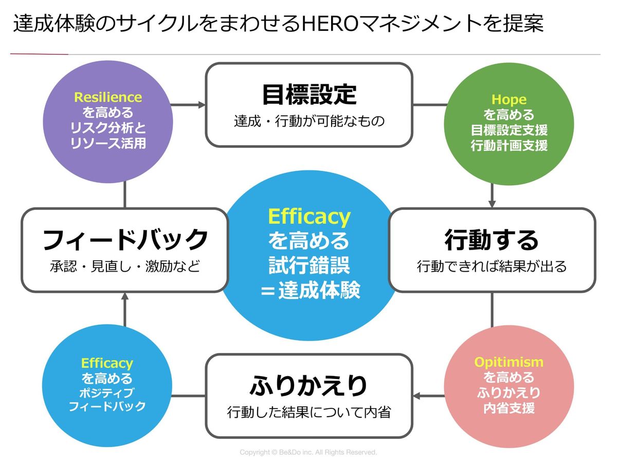 橋本:なので、マネジメントサイクルと先ほどの「HERO」を考えていくと非常にいいかなと思います。目標設定をして、行動して振り返ってフィードバックをする。この一連が試行錯誤のサイクルだと思うんですけれども、これを繰り返すことで、それぞれの分野や領域の熟達度や経験値が積み上がって、自信につながってくるわけなんです。