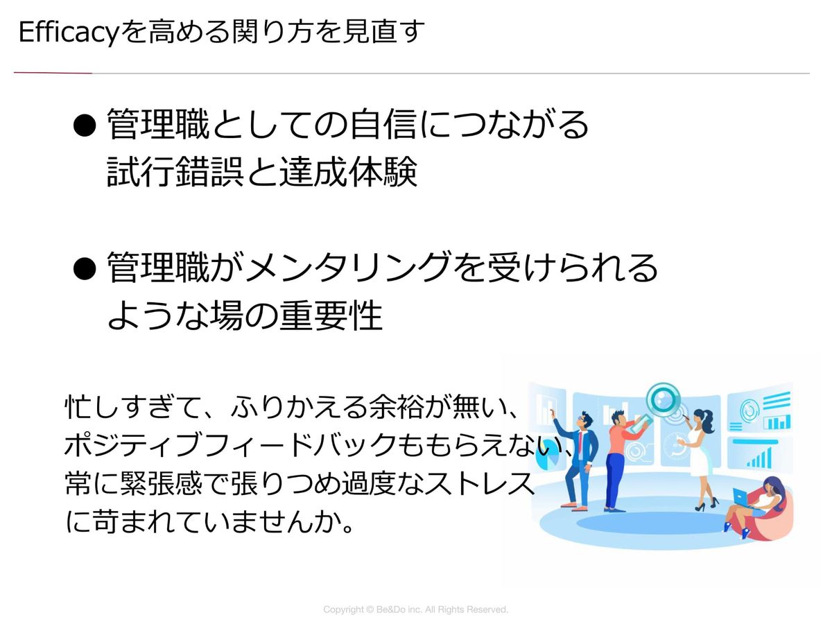 過度なストレス環境や心身の健康を無視したような状態。「管理職なんだから、やって当たり前でしょ?」なんて言われてしまうと、どんどん疲弊していってしまいます。これって「Efficacy」を下げていくやり方なんですよね。