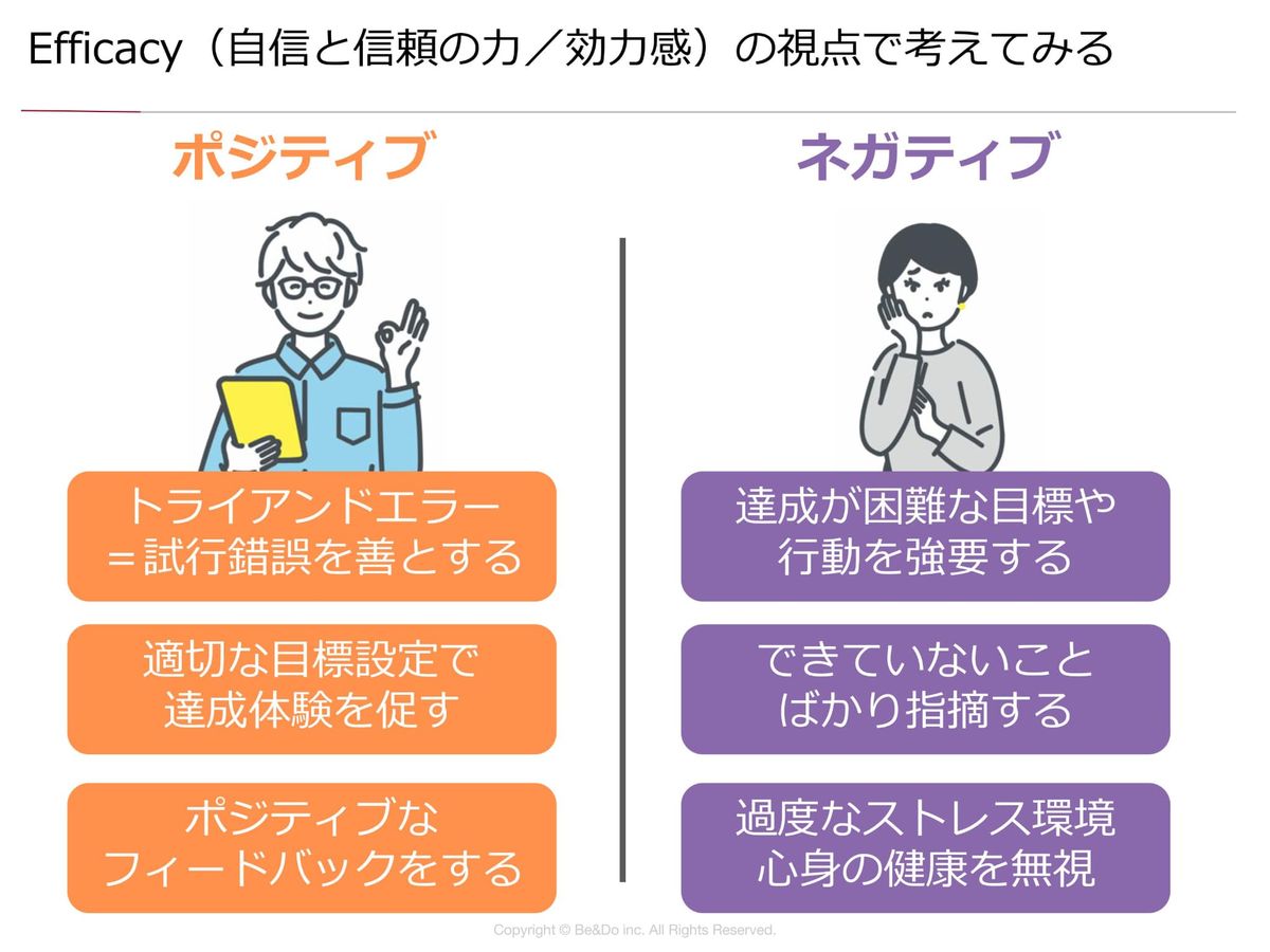 例えば達成が困難な目標や行動を強要してしまったり、できていないところばかり指摘したり。一般の世の中の会社でよく聞く話なんですけども、管理職って本当に褒められづらいんですよね。できていないところを厳しい感じで言われてしまうと、どんどん自分の自信がなくなっていくことだってあるんですよね。