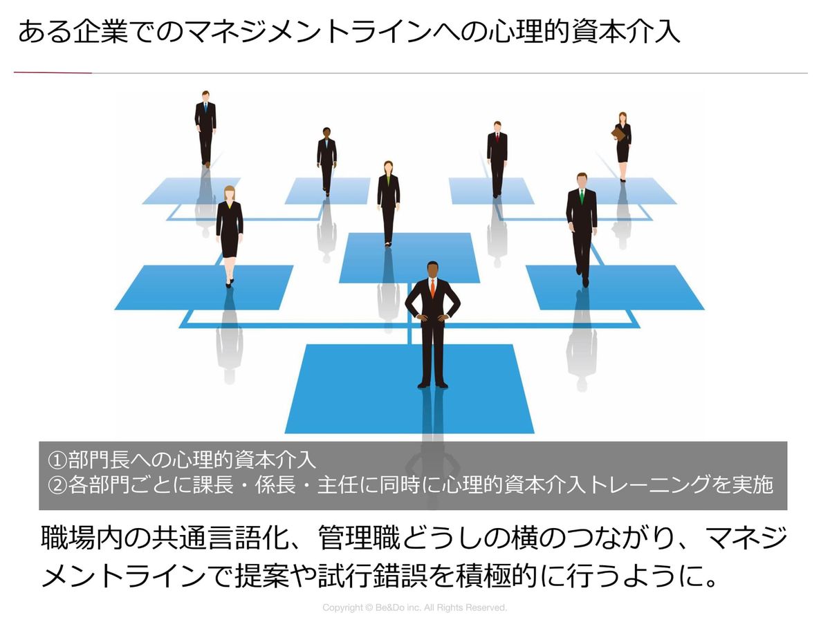 橋本:これは、ある企業のマネジメントラインの心理的資本にちょっと介入した事例なんですけれども。1点だけ事例をお伝えしておくと、やはりこの会社の管理職のみなさんも確固たる自信はなかったり、会社の進んでいる方向に自分は合っているのかとか、いろいろな不安を抱えながら仕事をしていらっしゃったんですよね。