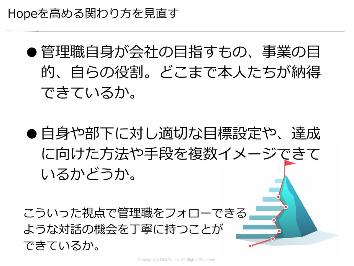 この2つが揃ってくると、先ほどの希望「Hope」は高まっていきます。管理職をフォローしたり、対話の機会も重要だという話や4つの戦略もありましたけれども、そこを丁寧に持っていただきたいなと思います。