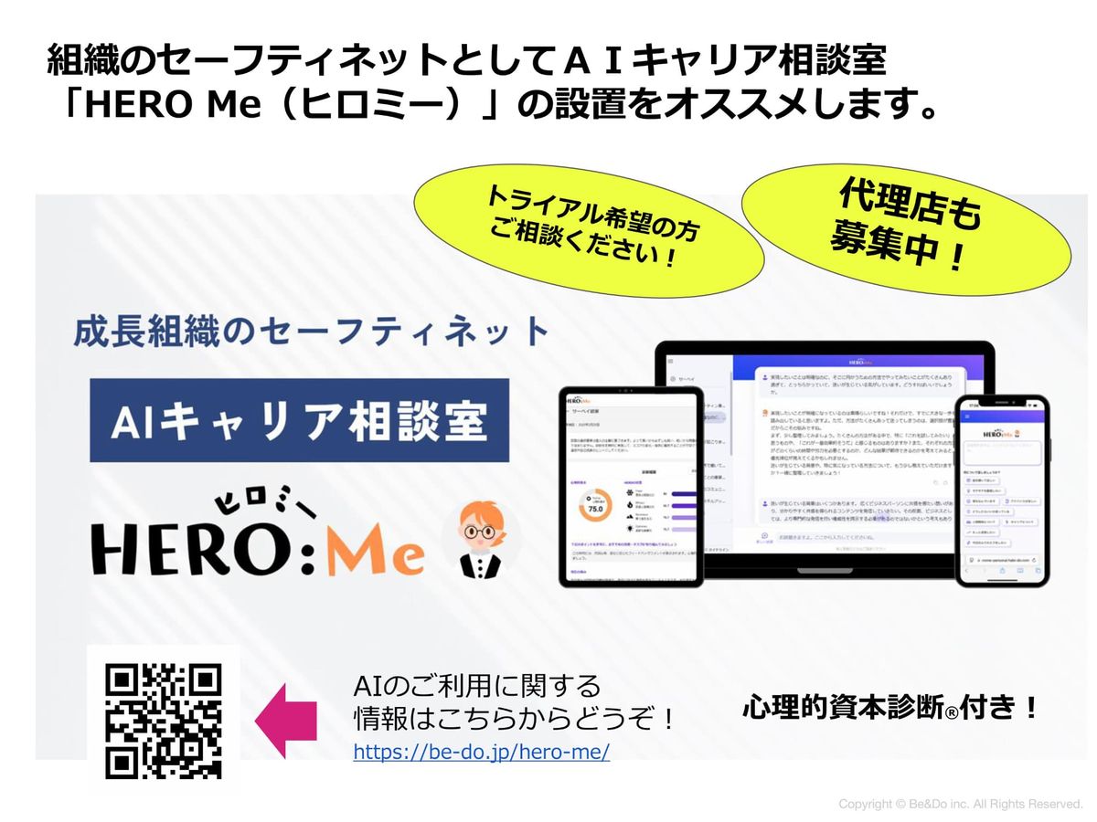 管理職の方も、孤独にさいなまれたりすることが非常に多いんです。その時に思いを吐露するだけでも救われることもありますし、「具体的にどうしていったらいいの?」という時に、先ほどの「HERO」の視点で思考整理を手伝ってくれる仕組みになっております。こちらもお問い合わせいただけたらなと思っております。心理的資本の診断もこの中でできることになっております。