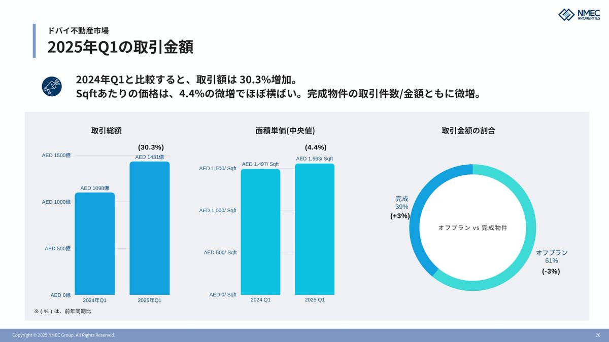 つまり高額な物件の取引が増えたというところと、もしくは新しいオフプランの物件の面積が少しずつ減ってきているかもしれないということのどちらかが考えられます。