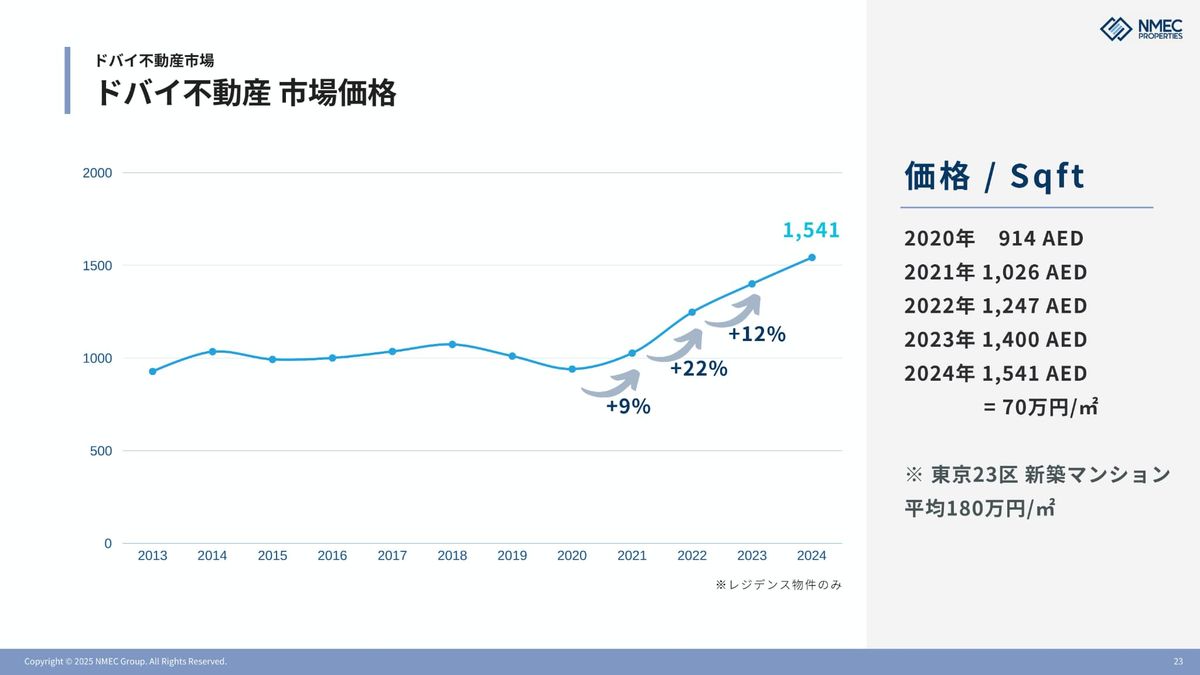 2024年のデータを平米に直すとだいたい70万円くらいになっていまして、比較対象として東京23区の新築マンションの平均を取っているんですが、こちらが180万円ですので、ドバイの不動産マーケットは東京に比べるとまだまだ安いのではないかなということになります。