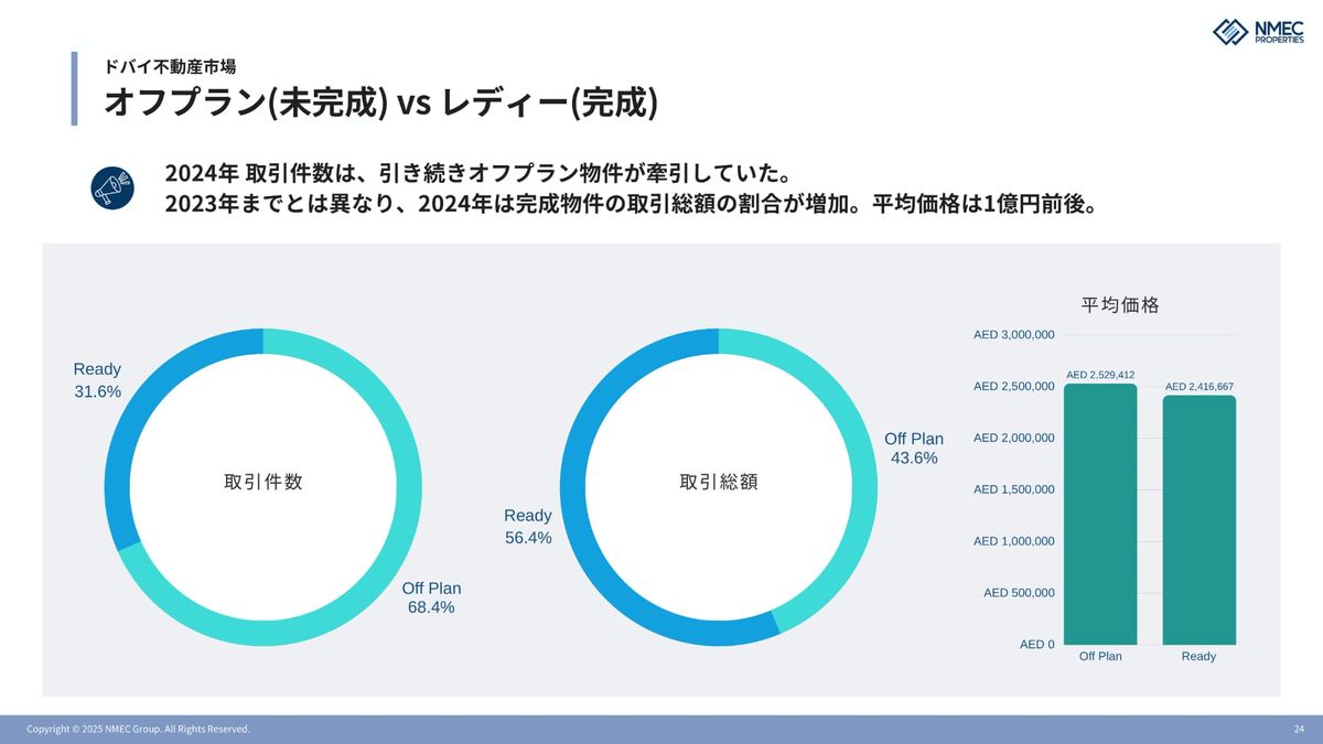 ただ平均価格自体は両者そこまで変わらないというところです。ここから言えることとしては、2023年まで実はかなりオフプランが占めていたので、取引総額の割合は完成物件が増加しております。