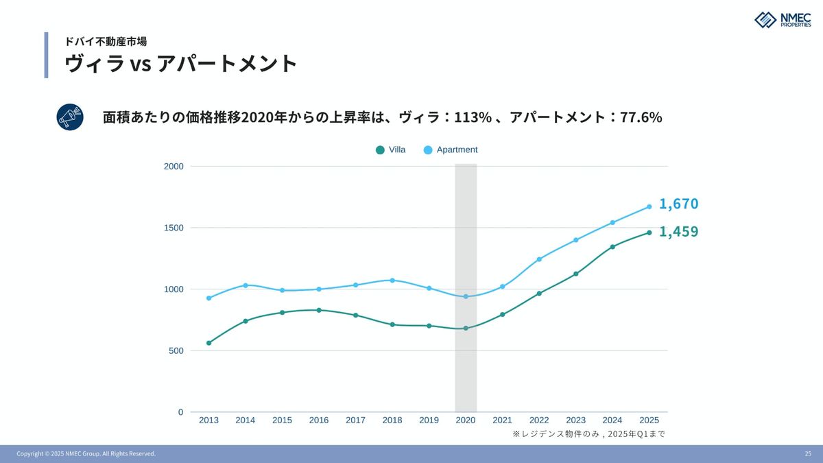 そして次に「ヴィラ(戸建て)」ですね。戸建てと「アパートメント」、つまりこれは日本で言うマンションです。この2つを比べてみると、もちろん2つとも右肩上がりで上がっております。