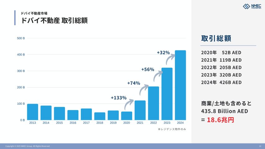 また取引総額、金額についてももちろん最高金額に達しています。コロナの時から133パーセント、74パーセント、56パーセント、32パーセントというかたちで、右肩上がりで取引総額もどんどん成長しております。商業物件や土地の物件も含めると、だいたい1年間で18兆円〜19兆円ぐらいの取引が行われております。