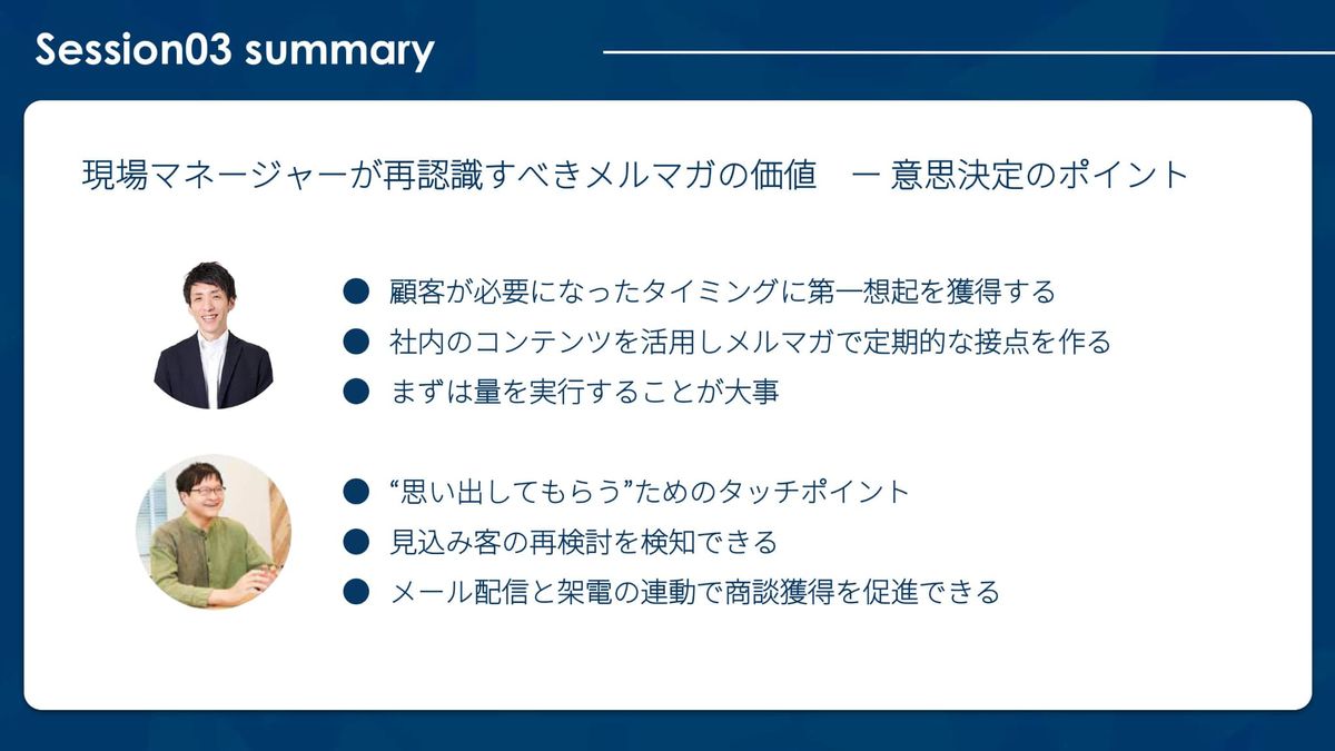 高嶋:そうですね。メールはタッチポイントという認識をした上で、すでにもやもや考えている方が検討段階に入った時に、ちゃんと問い合わせていただけるように意識した上でメール配信をしていただければなと思います。