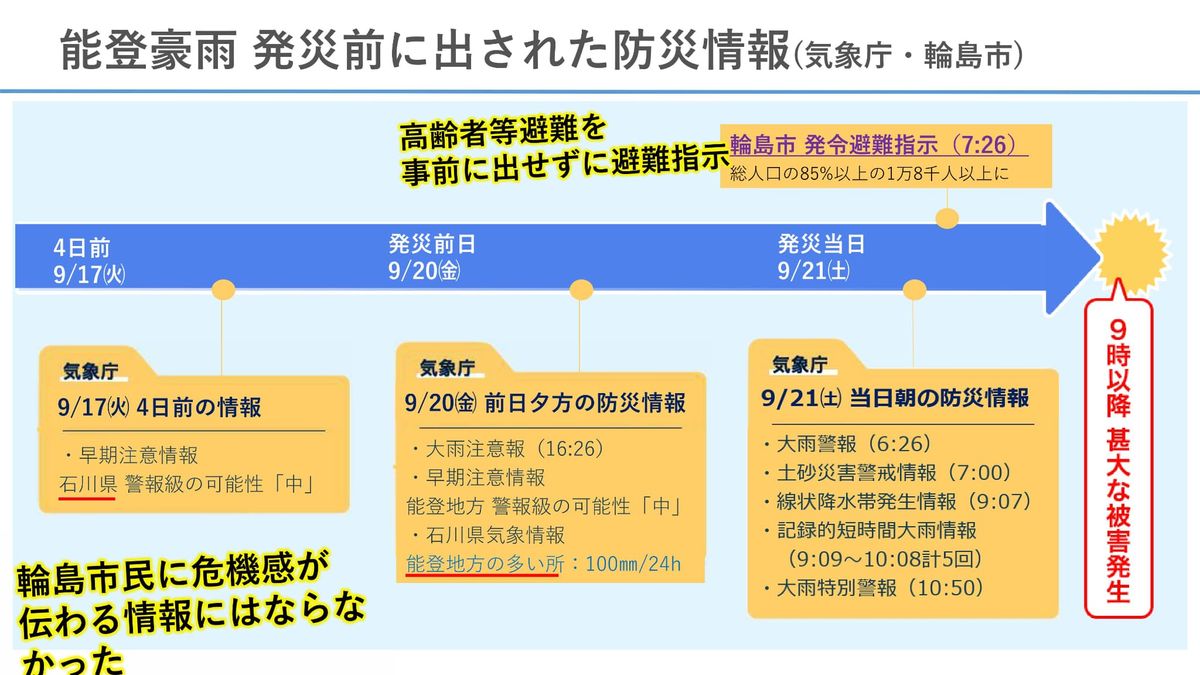 ちょっと見ていただくと、当日の朝6時半とか7時に、大雨警報や土砂災害警戒情報などが発表になって、それをきっかけに輪島市の行政側が、7時半ぐらいに避難指示を発令しました。