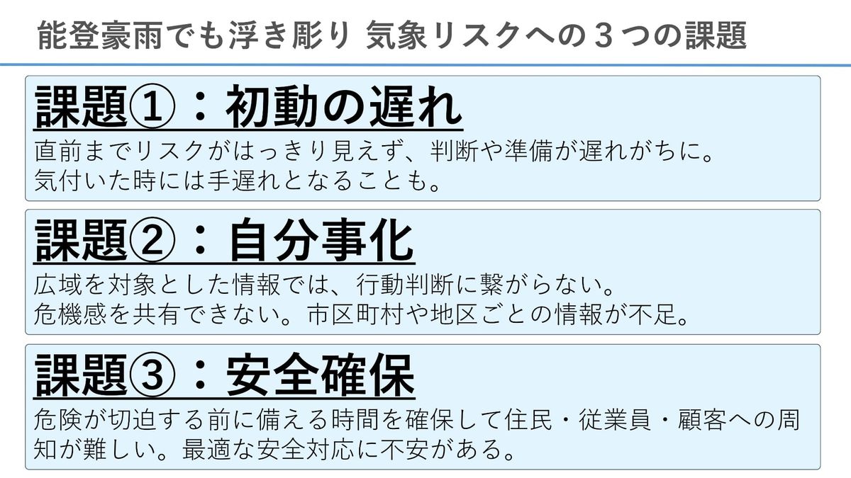 課題としては、やはり先ほども見ていただいたように、直前までリスクがなかなかはっきり見えず、ちょっと手遅れというか、防災対応も後手に回ってしまう。初動の遅れというところがまずありました。