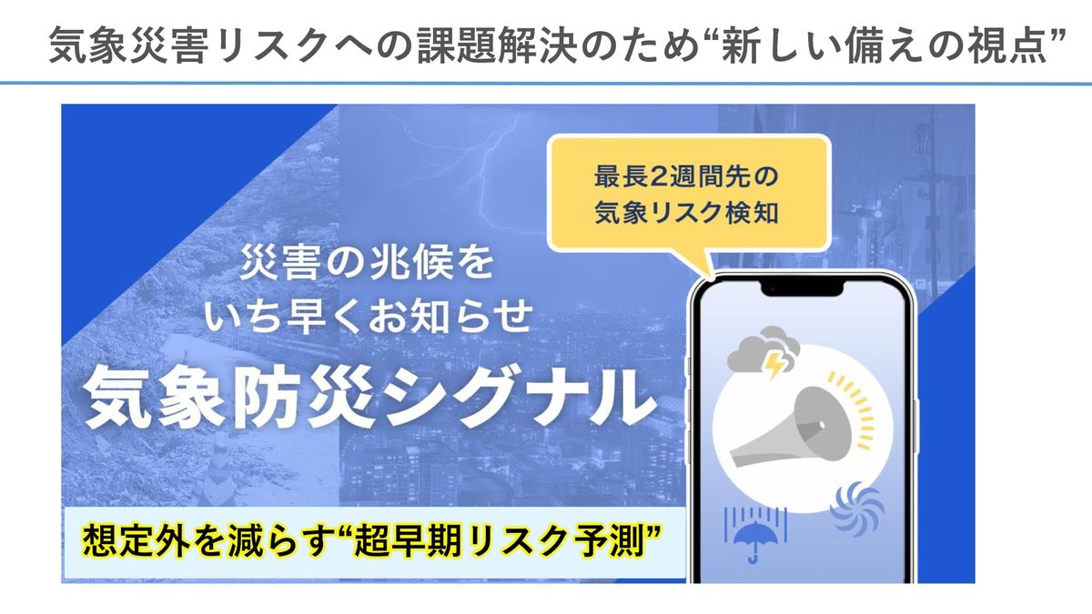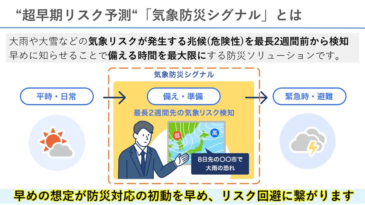 森山:超早期リスク予測は、そこまでの落とし込みをして、お伝えするというものになります。具体的にどういったものになるかというと、大雨だけではなくて大雪、暴風なども含めて、気象リスクが発生する危険性を最長2週間前から検知して、備える時間を最大限化する防災ソリューションになります。