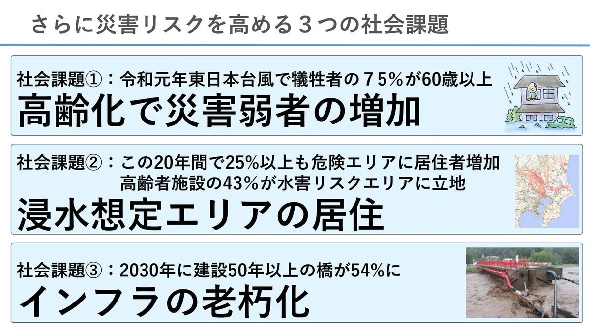 森山:人手不足や人件費高騰というところもあって、なかなかすぐに進まないこともあります。こういった社会課題と、先ほど申し上げた激しさを増す気候変動によって雨・風がより凶暴になってしまうと。