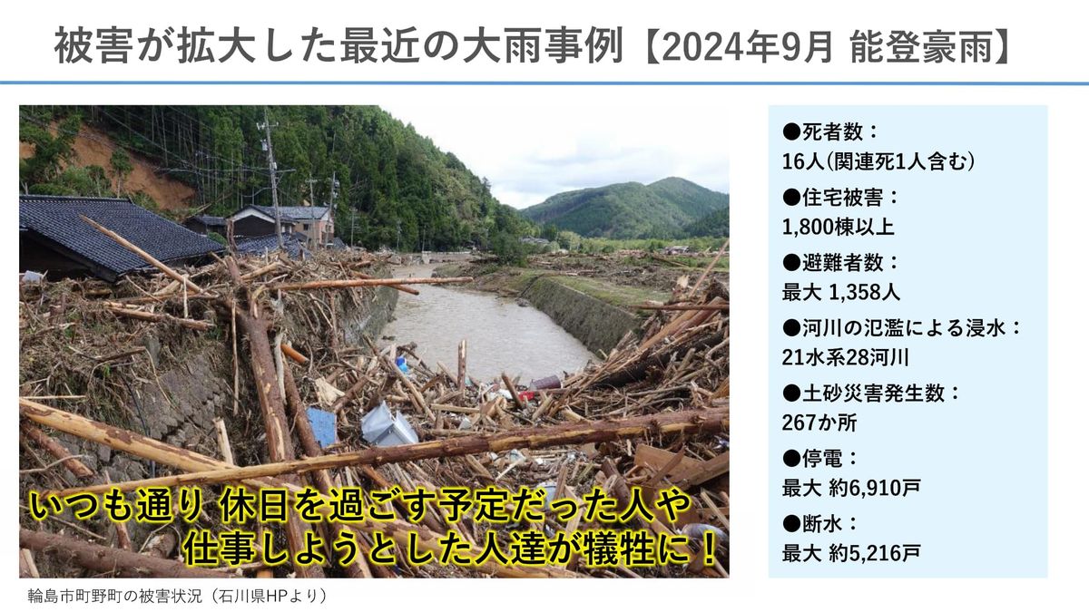 森山:なんとかそこの課題を解決できないかというところで進めています。ここでちょっと事例を1つ見ていただきたいんですが、一番記憶に新しいもので、2024年9月に能登半島豪雨が起きた時に、どれくらいの被害だったかというデータになります。