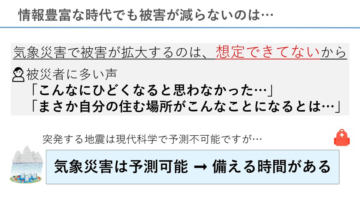 みなさんがスマホで、これだけの情報を自分で取れる時代にもかかわらず、被害がなかなか減らないのは、もう1つ視点を変えると、想定がなかなかうまくできていないことが多いと言えると思います。
