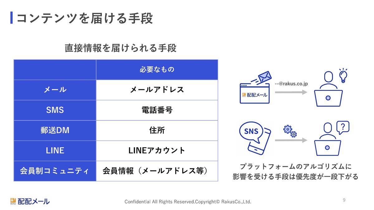 では、直接コンテンツを届ける手段で何があるか考えてみたんですが、例えばメール、SMS、LINE、郵送DM。あとは会員制コミュニティのような、お客さまのメールアドレス、電話番号、住所といった個人情報を使って直接アプローチするようなものと考えております。
