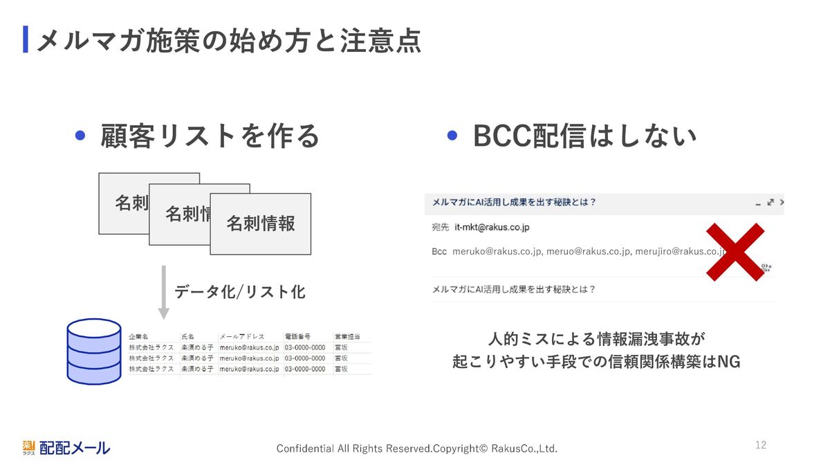 あとは、メルマガを送るのにBCCの機能を使わないことですね。OutlookやGmailにBCCの機能があると思うんですけど、毎年たくさんの企業がこの方法を使って、誤ってtoやCCに宛先を入れてしまい、情報漏洩の事故を起こしております。