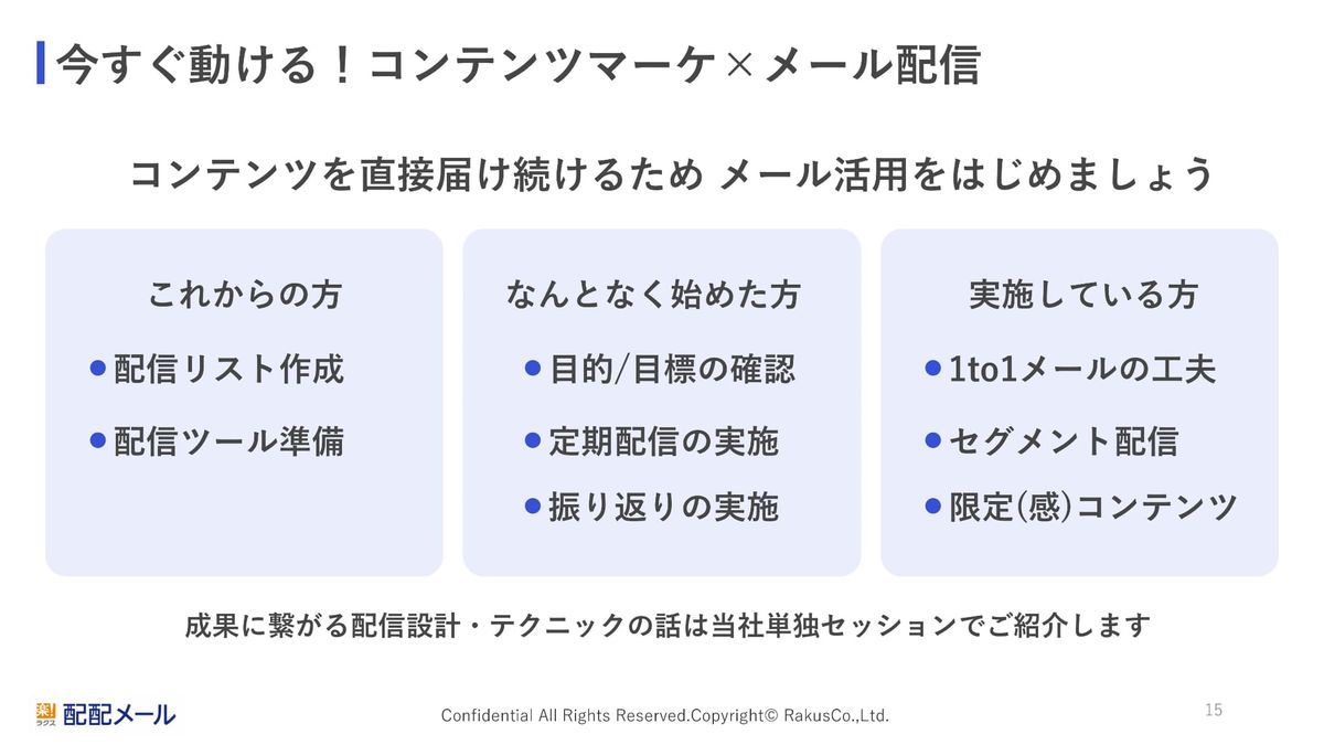 1つが、顧客リストを作るところから始めればいいかなと思っております。過去にいただいたお名刺をExcelでデータのリストにするとかですね。このあたりは配配メールでご協力できる部分もあるので、お困りの方がいたらアンケートでお声がけいただければと思います。