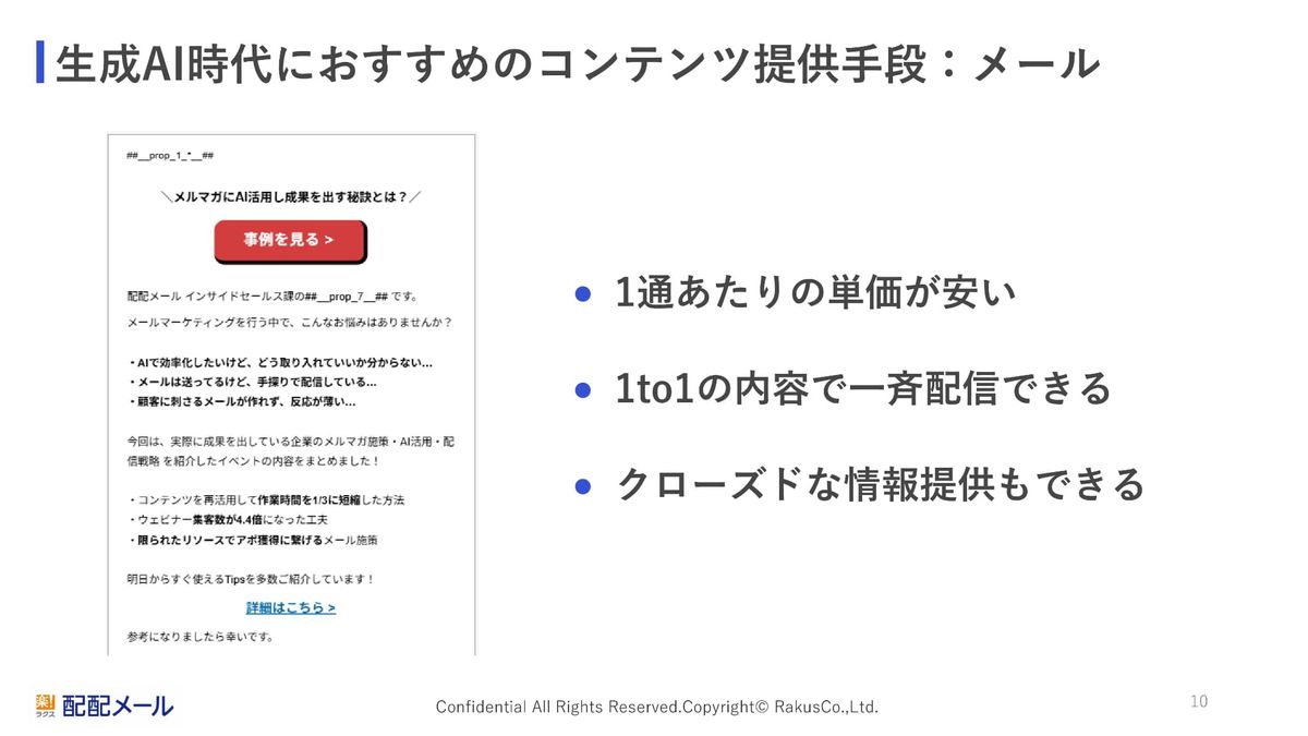 浅井:今、僕も聞かせていただいていて、ちょっと質問が思い浮かんだんですけど。弊社もメールなどをたくさんお送りしていて、今コンテンツはAIを使ってめちゃくちゃ作れるようになっています。これだけ情報を作れちゃう時代に、ラクスさんでは工夫して届けるようなことをされているんですか?