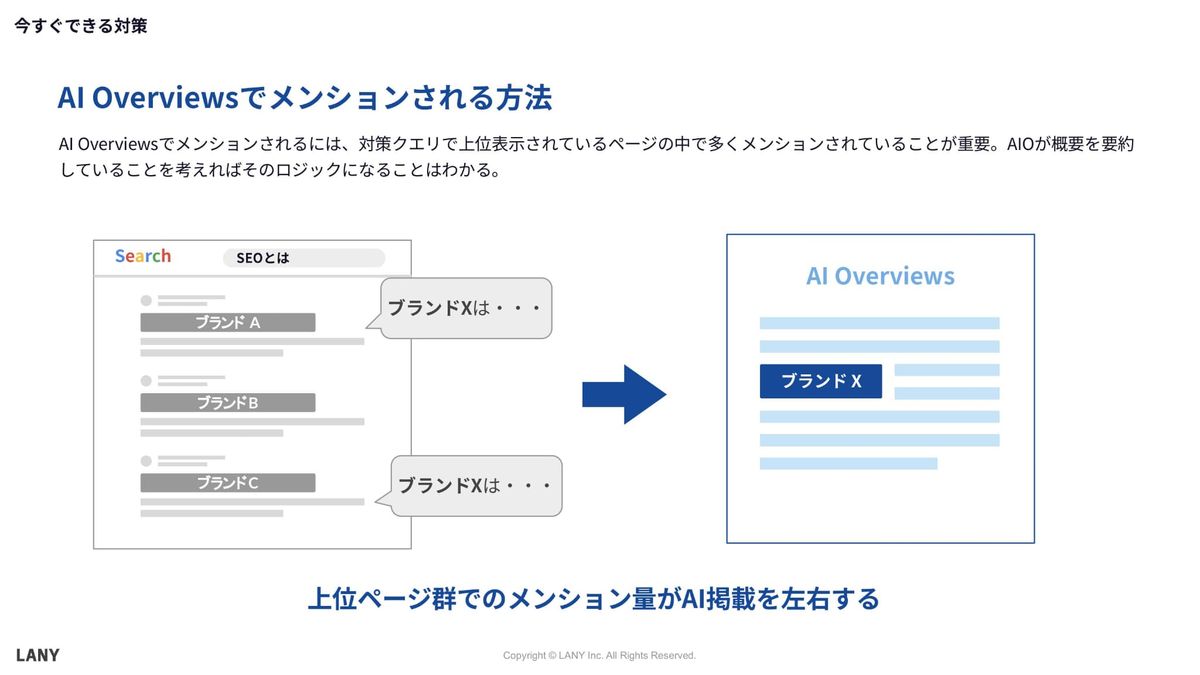 もし今からSEOをやるなら、そこを意識していただくと、LLMOも意識できるんじゃないかなと思っています。例えば30代の椅子に関連するコンテンツを作るといった情報の発信ができて、中長期で生成AIに情報を拾ってもらって、自社を想起させることができるかなと思うので。