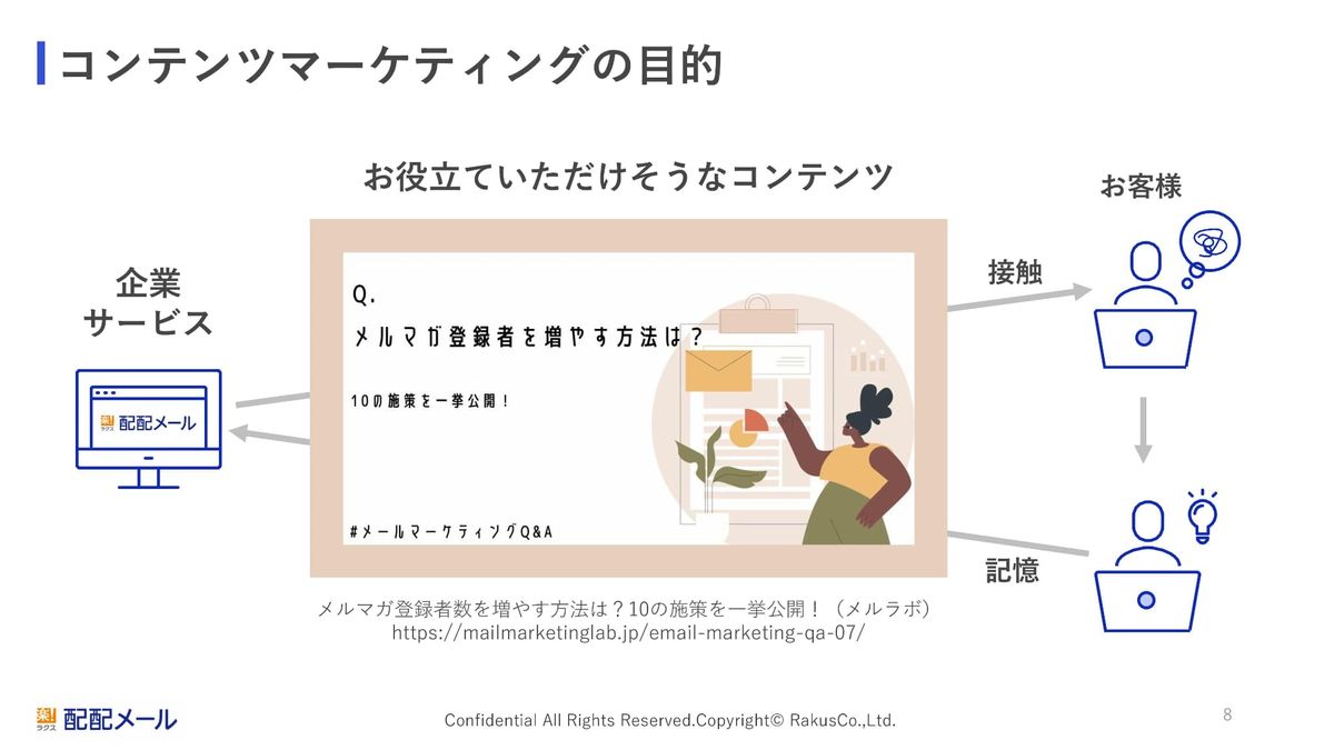 コンテンツを作る目的は、そもそもお客さまが探し物をしている時に、見つけていただくことで接点を作ったり、あとはそれを役立てていただくことで「この企業さんの発信する情報、いいな」と信頼を寄せてもらう。