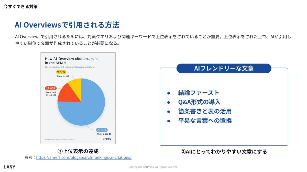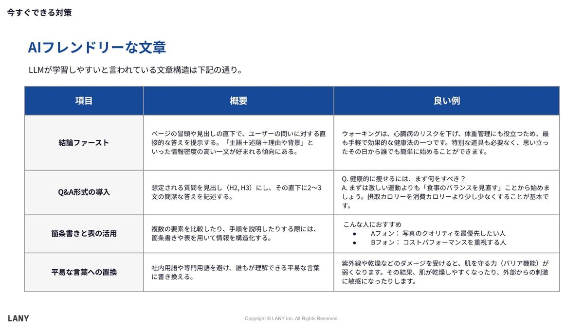 例えば結論ファーストだったり、Q&A形式で質問と答えがバコっとまとまっていると、AIがその情報を引っ張りやすいということがあるので。そういったことを意識して文章を作ってあげると、すごくいいんじゃないかなと思っています。