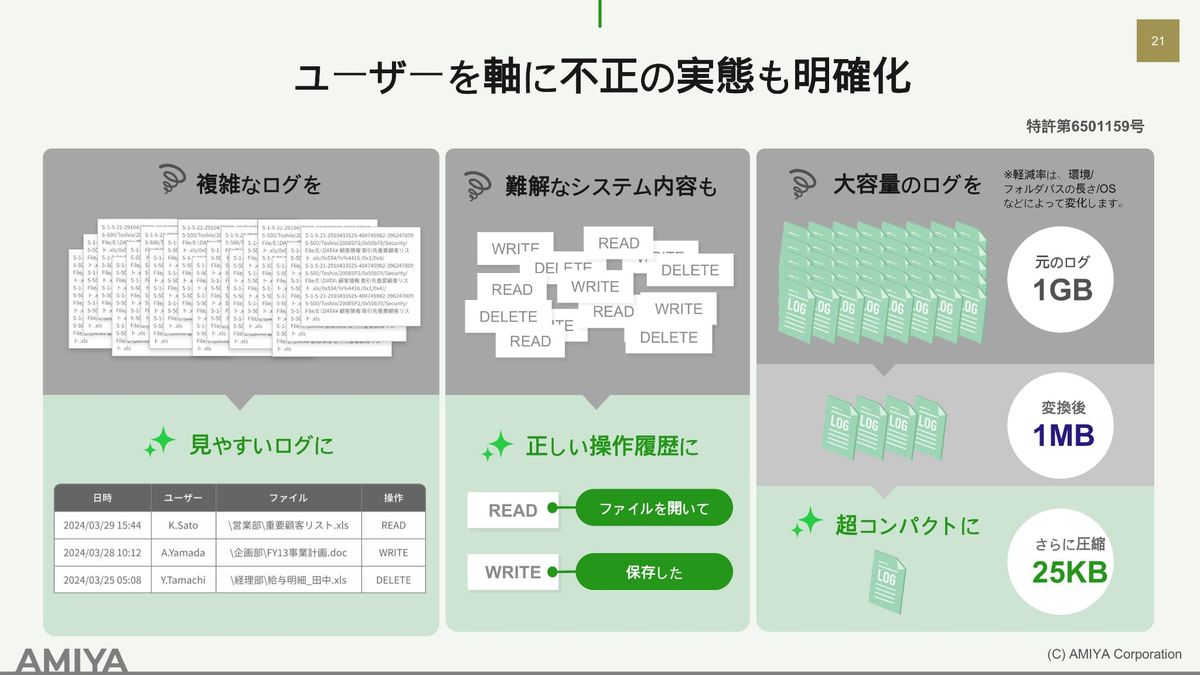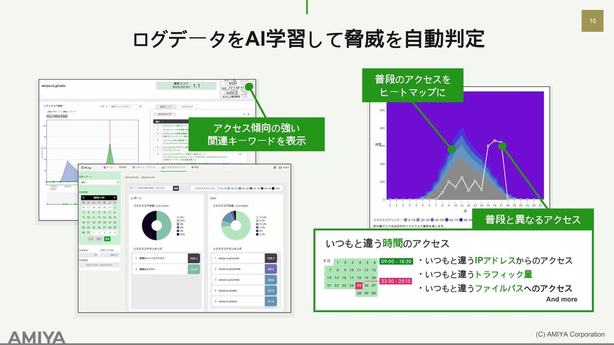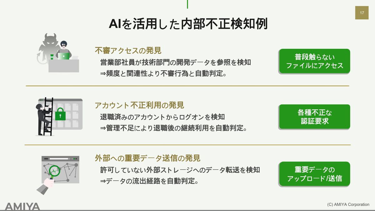 具体的な例で申し上げると、いつもと違う時間帯にアクセスしていたケースや、いつもと違うファイルパスへアクセスしているケースをしっかりと把握して、ユーザーさまに通知することが可能になっています。ですので、逐一ログを見ていてもなかなか気づきづらい部分をAIにお任せいただける次第でございます。