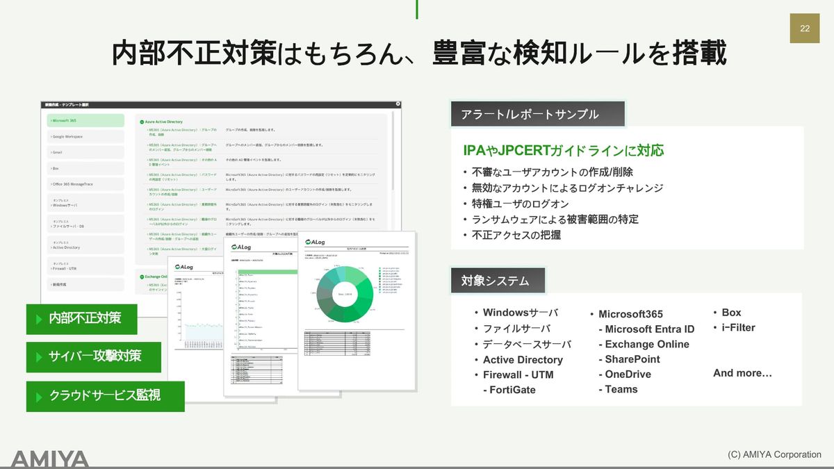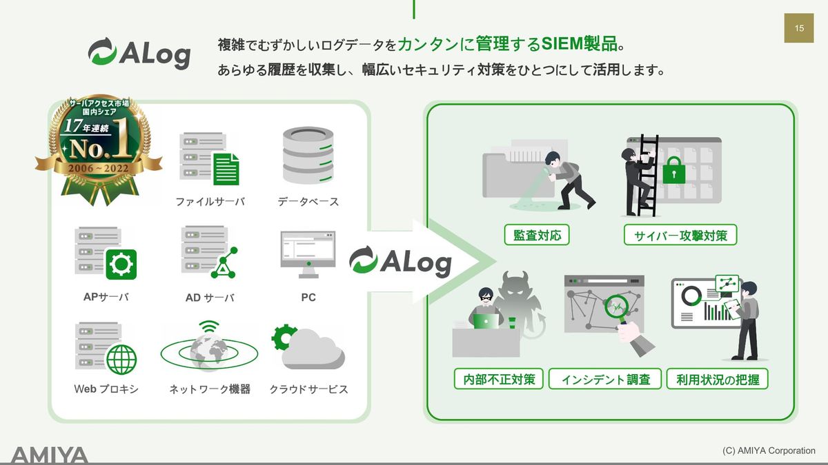 弊社のALogであれば、先ほど内部不正対策で申し上げたようなサーバーへのアクセスや、AD(Active Directory)の認証、クラウドストレージのアクセスなど、さまざまなログを収集して、異常検知の体制を整えることが可能になっています。内部不正の対策として、ぜひ弊社のALogをご検討いただけますと幸いです。