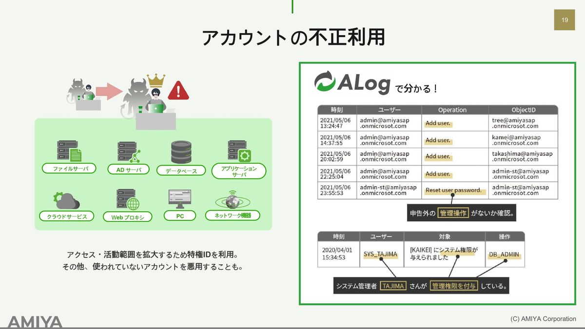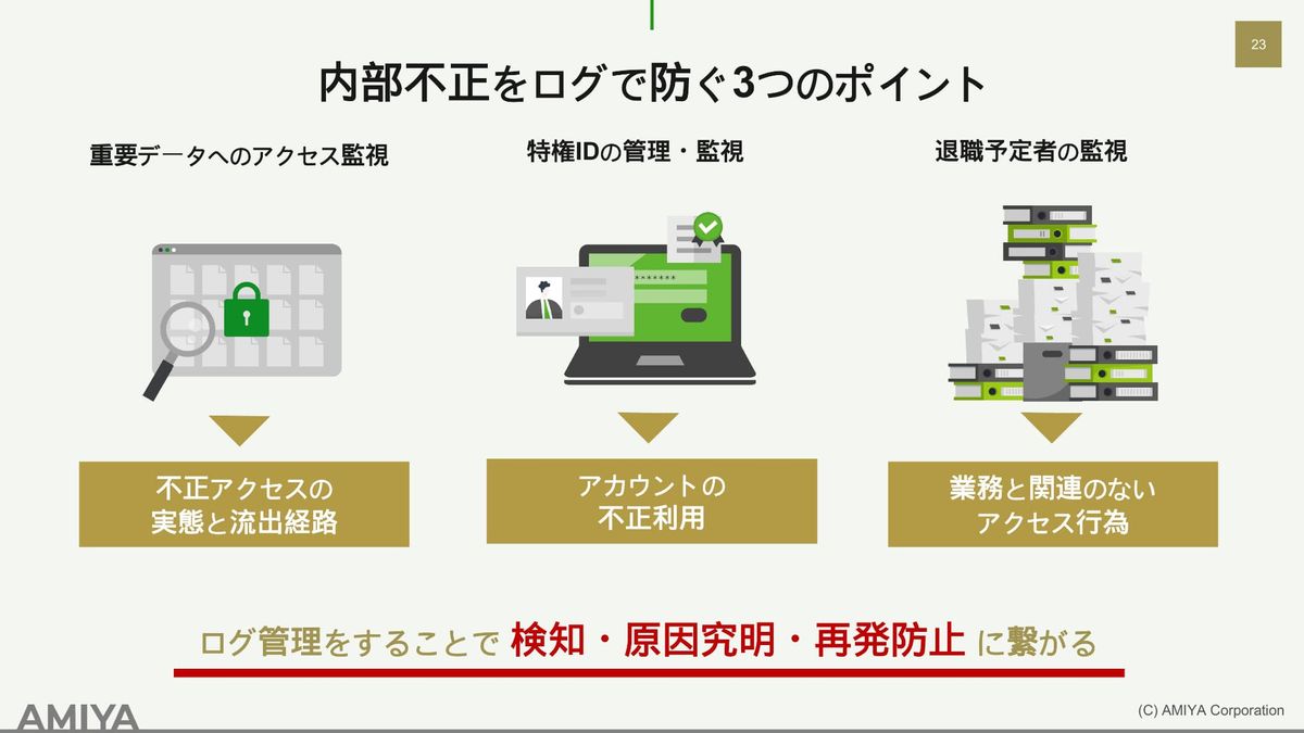 あとは、特権IDの管理・監視というところでアカウントの不正利用がないかの把握や、退職予定者がすでにわかっている場合であれば、特に注意して、業務と関連のないアクセスがないかを確認していただくことが必要です。