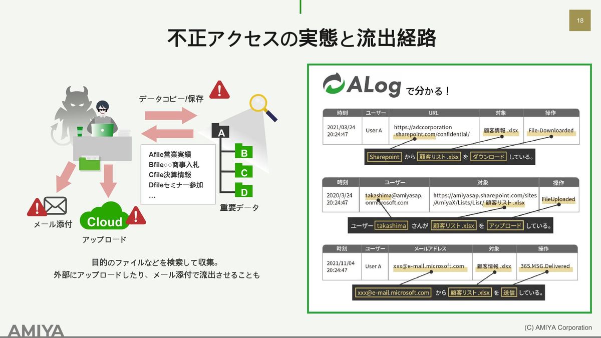 具体的なログを見てまいりますと、先ほどの証拠提供のところでも投映したかたちになりますが、例えば「Microsoft 365」の「SharePoint」から、「顧客リスト」のファイルをダウンロードしているというログをALog上で確認します。