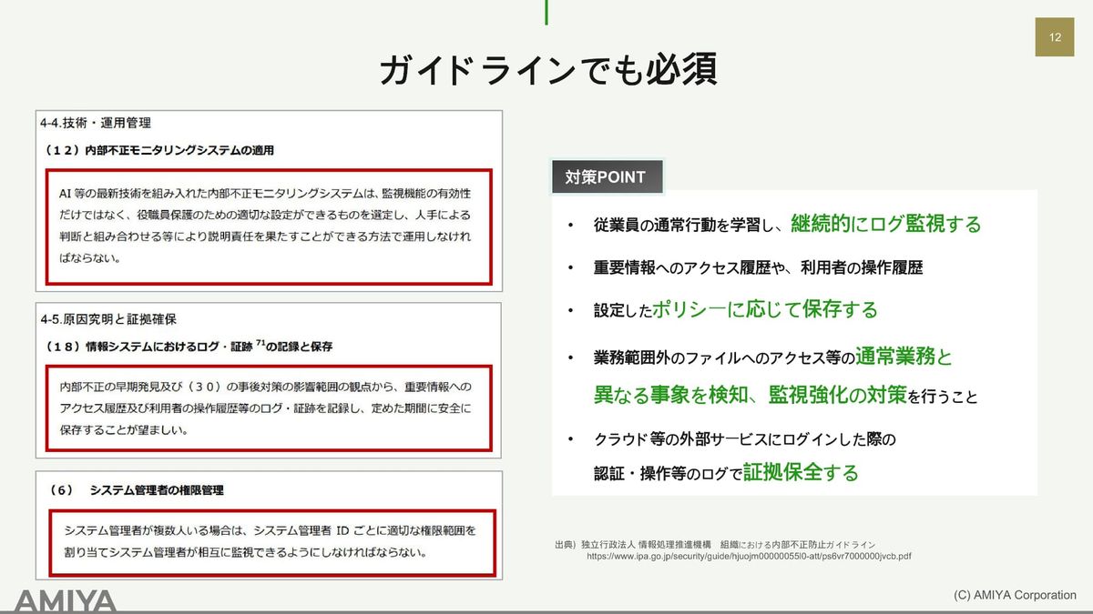 IPA(独立行政法人情報処理推進機構)のガイドラインの中でも、内部不正の対策では、やはりログの重要性が挙げられております。右側でポイントをご紹介しておりますが、継続的にログ監視をしていただいたり、組織の中で設定されたセキュリティポリシーに応じて長期のログ保管をしていただくというところ。