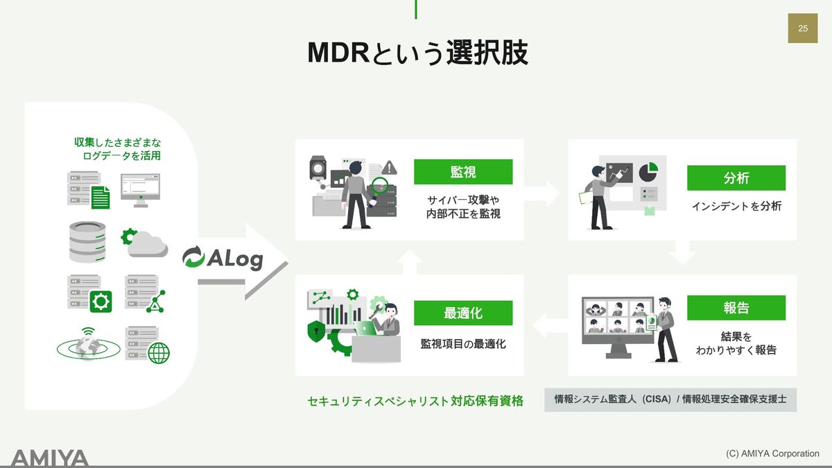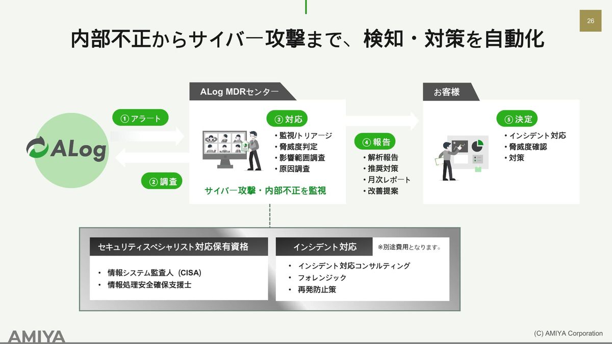 実際にアラートの調査や分析になかなか時間が割けないかと思いますので、この部分を弊社のALogのAIリスクスコアリングやMDR(外部の専門家が企業をサイバー攻撃から24時間365日監視し、脅威を検知・対応する)サービスで異常検知して、お客さまに分析内容を連係するというところですね。