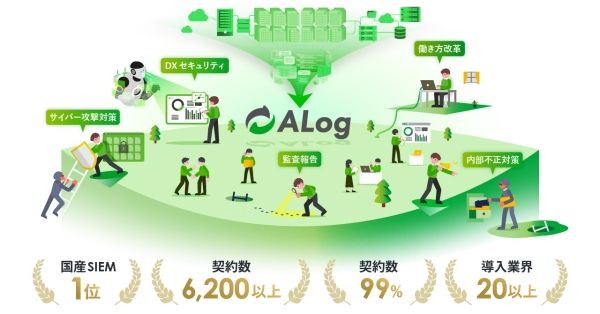 【国産No.1 SIEM「ALog」】とは独自のログ翻訳変換技術とAIの不正予兆検知により、多種多様なITシステムから集約した複雑で膨大なログデータをわかりやすく管理するSIEM製品です。専門知識やノウハウを要さずに、内部不正対策やサイバー攻撃対策、障害原因の追究、ワークスタイル変革など、取集したログをありとあらゆるビジネスの課題に活用させることが可能です。これまで国内外6,000契約以上の導入実績を誇り、国産SIEMにおいてNo.1(※)を獲得しています。
