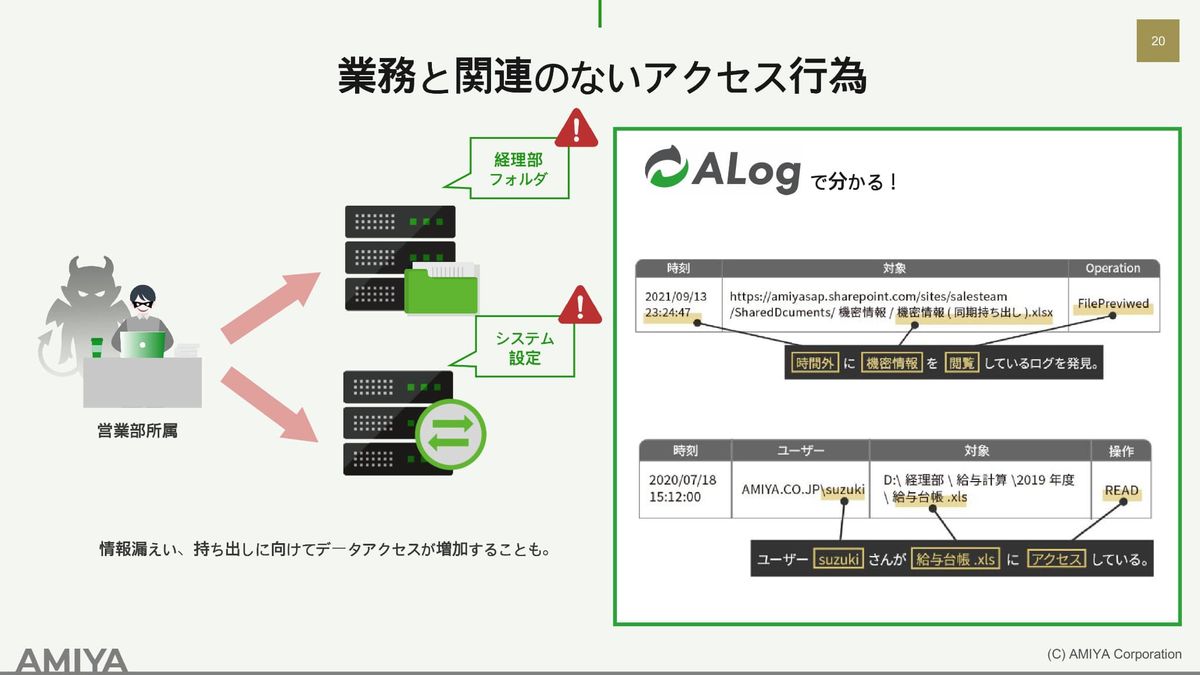 実際の検知例で申し上げますと、不審アクセスの発見というところで、営業部の社員の方が技術部の開発データを参照しているといった、ふだん触らないファイルにアクセスしているケースですね。頻度や関連性の部分から不審行為と自動的に判定しています。