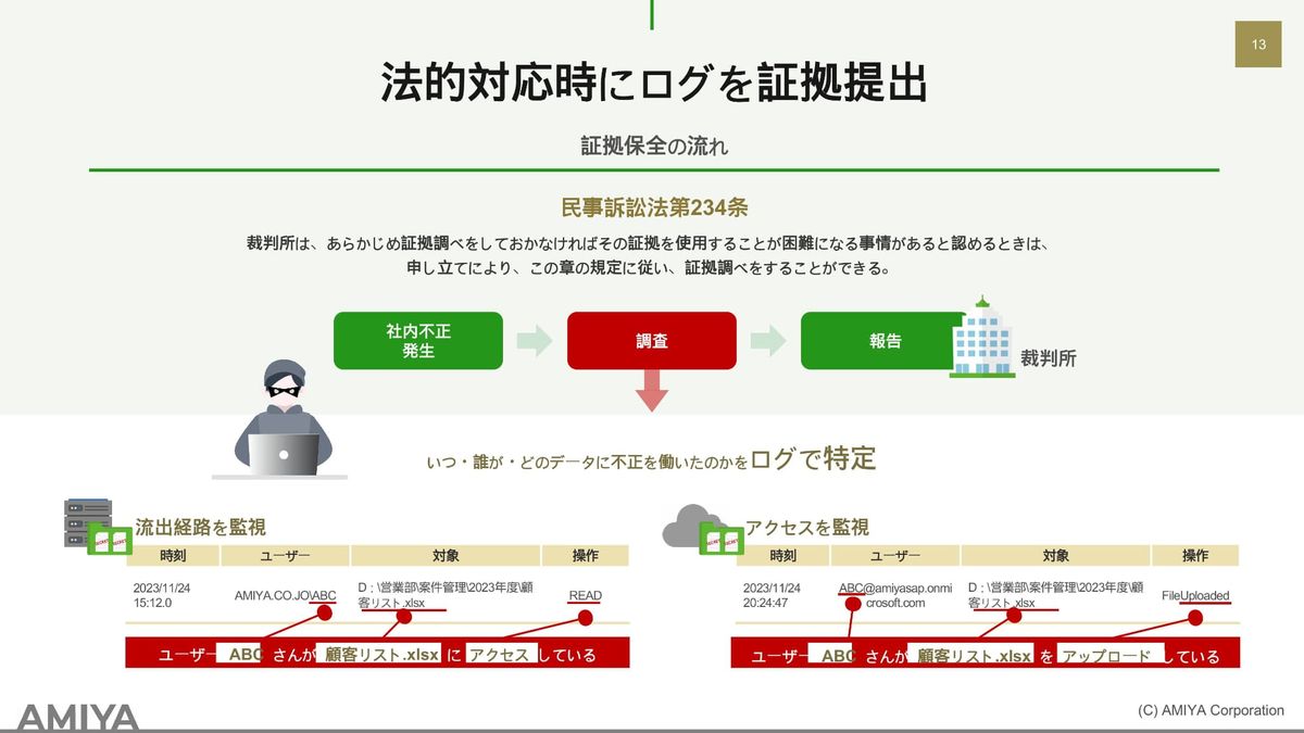 また、実際に内部不正が生じてしまった場合に、訴訟などでログを証拠として提供いただけます。例えば、どのユーザーさまがどのファイルにアクセスしていたかというところから、それをどこにアップロードしていたかというログを抽出して、訴訟などで証拠として提供することが可能です。