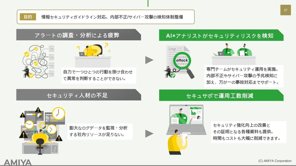あとは、人材不足というところもMDRサービスの中で、弊社が代行していくところになりますので、運用工数の部分も削減して、お客さま側から見れば、純粋にログ監視の内容を、弊社から連係した内容だけ見ていただければ、対策を進めていただけると存じます。