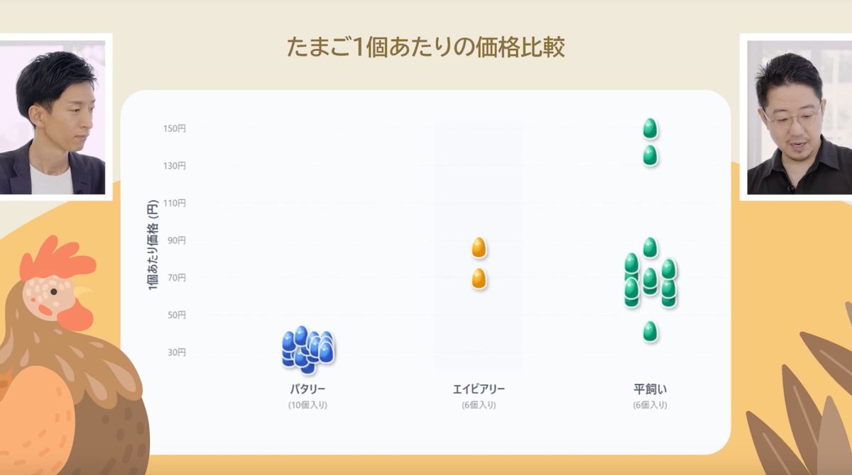 川崎:下はバタリーと似たような金額から、上は1個当たり150円ぐらい。かなり幅があるわけなんですけど、一般的にやはりバタリーがすごくお安くて。一方で平飼いやエイビアリーは高いということになりますか。
